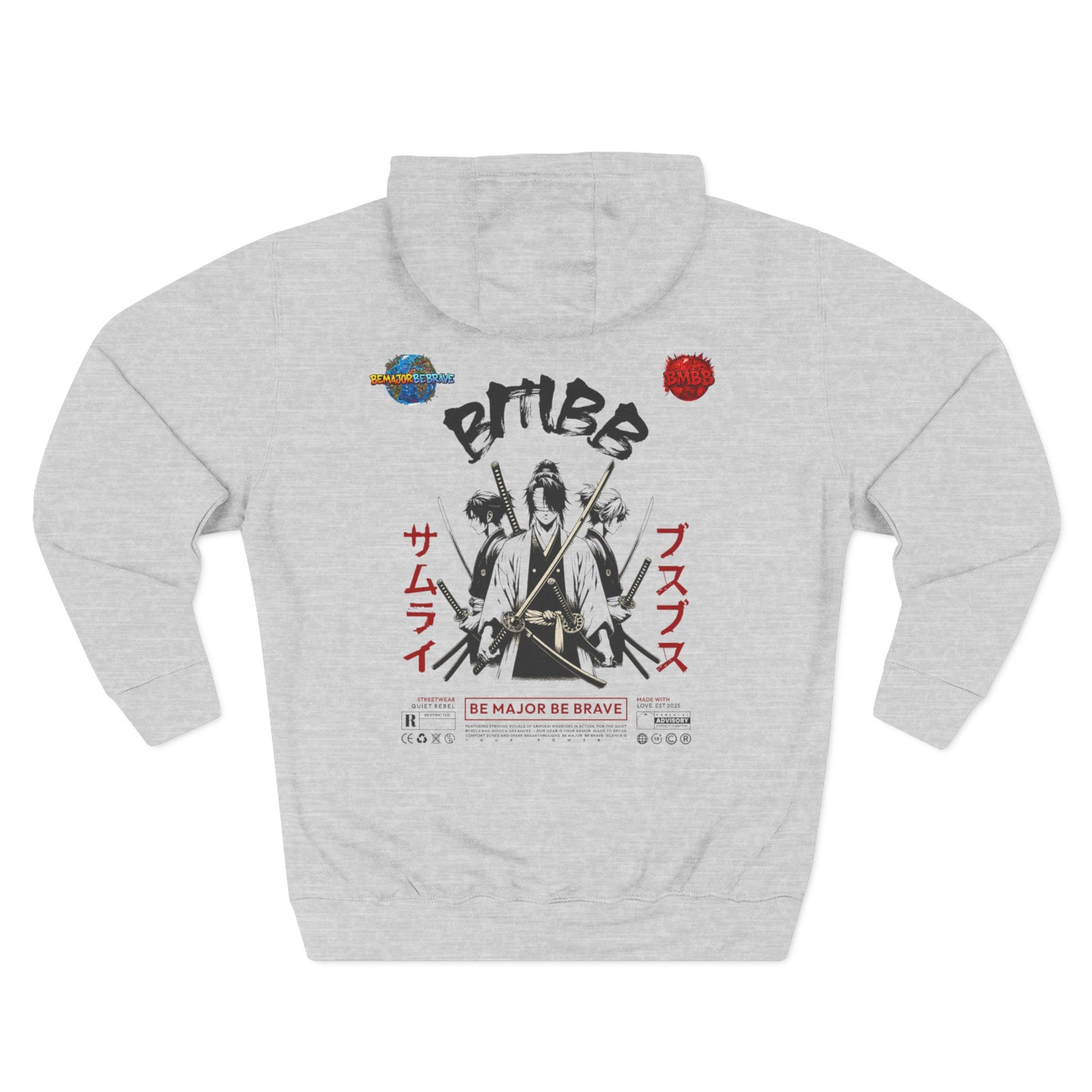 On the front : a bold BMBB vintage wax stamp, symbolizing authenticity and courage. on the back: three blindfolded samurai ronin-warriors who fight unseen battles-paired with our mission statement: For the Quiet rebels and hidden dreamers-our gear is your armor. made to break comfort zones and spark breakthroughs. Be Major Be Brave. Silence is power. Crafted from a soft cotton/poly blend, this storm grew hoodie delivers all-day comfort with a powerful edge. mid-weight, durable and built for movement-its made to remind you that bravery isn't loud, but its unstoppable.